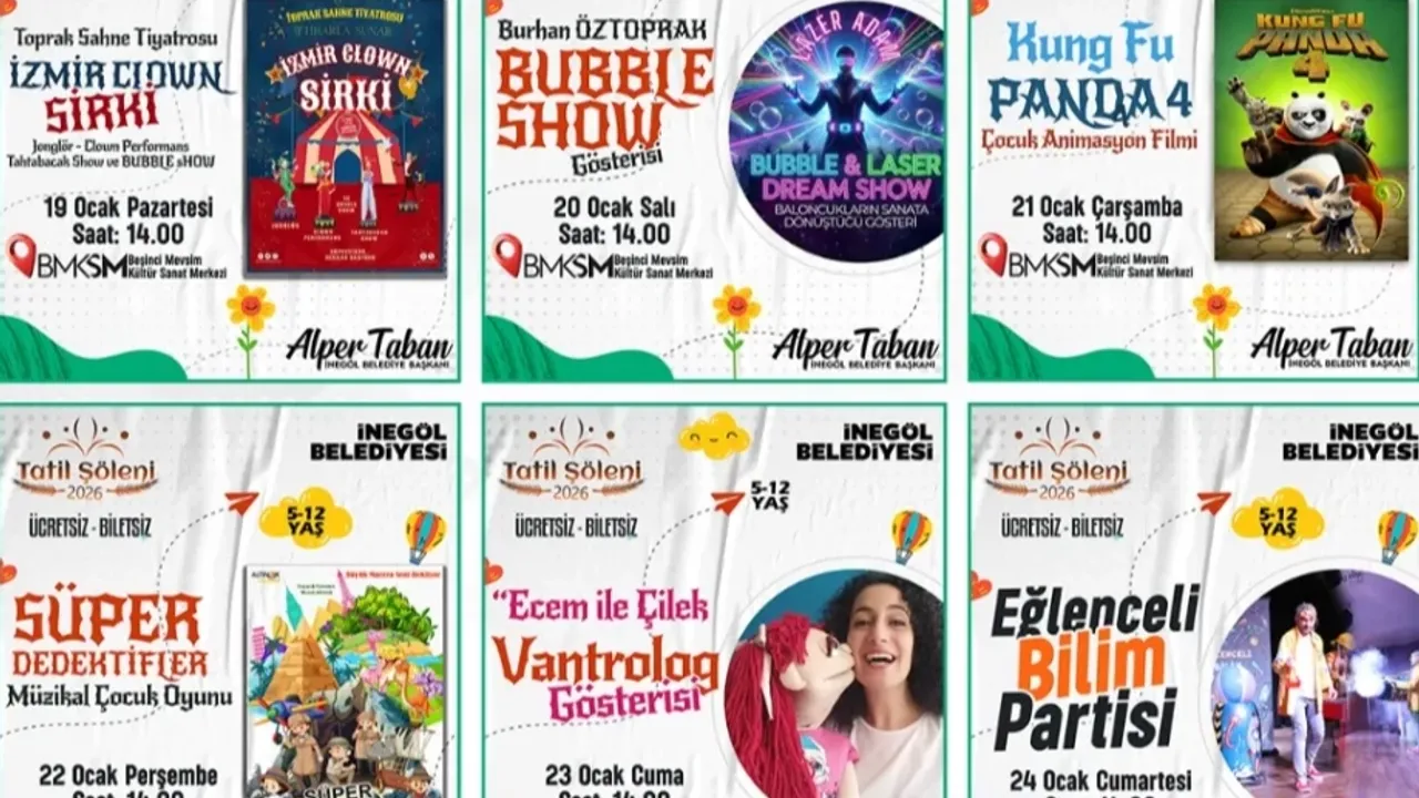 İnegöl Belediye Başkanı Alper Taban, ara tatilde çocukların keyifli ve verimli vakit geçirmesini önemsediklerini belirterek, 'Çocuklarımızın yüzünü güldürecek, hayal dünyalarını geliştirecek ve güzel anılar biriktirecekleri bir tatil programı hazırladık. Tüm çocuklarımızı Tatil Şöleni 2026 etkinliklerimize davet ediyorum.' dedi.