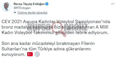 Başkan Recep Tayyip Erdoğan, sosyal medya hesabından yaptığı paylaşımda, CEV 2021 Avrupa Kadınlar Voleybol Şampiyonası'nda bronz madalya kazanan A Milli Kadın Voleybol Takımı'nı tebrik etti.