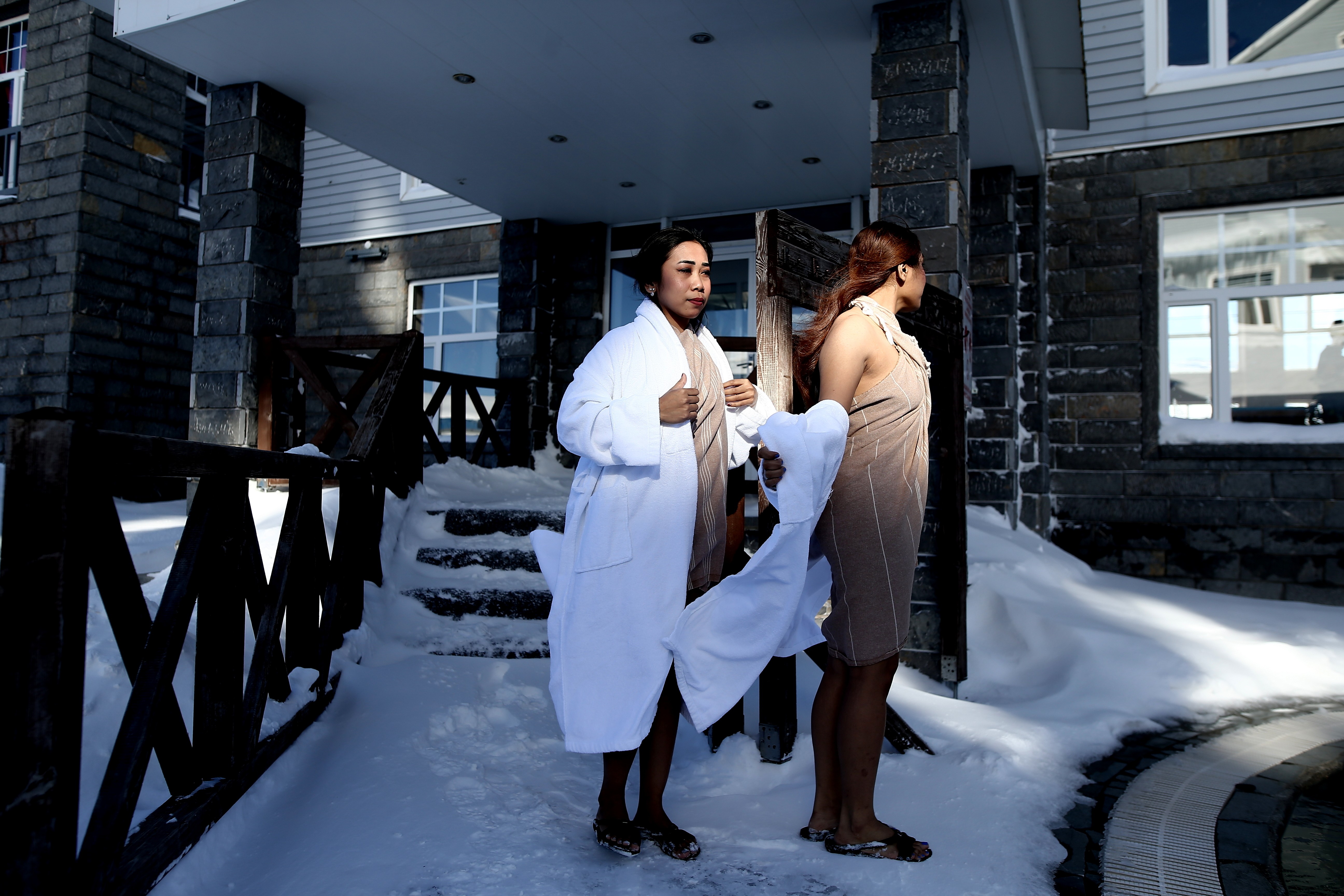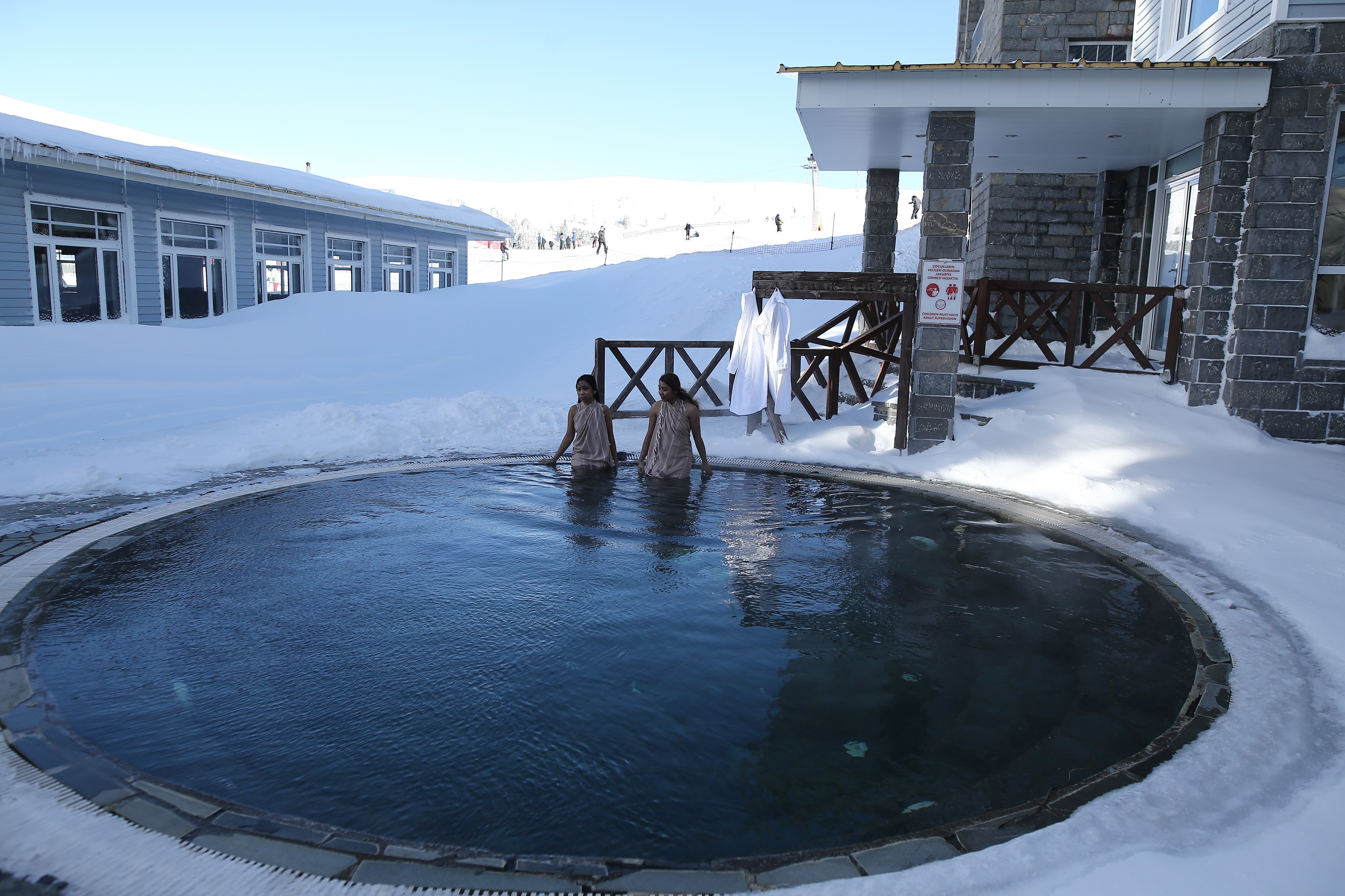 Kayak yaparken hamam sefası yapmanın keyfini yaşayan turistler, dondurucu soğuğa rağmen peştamalla dışarıda geziyor.