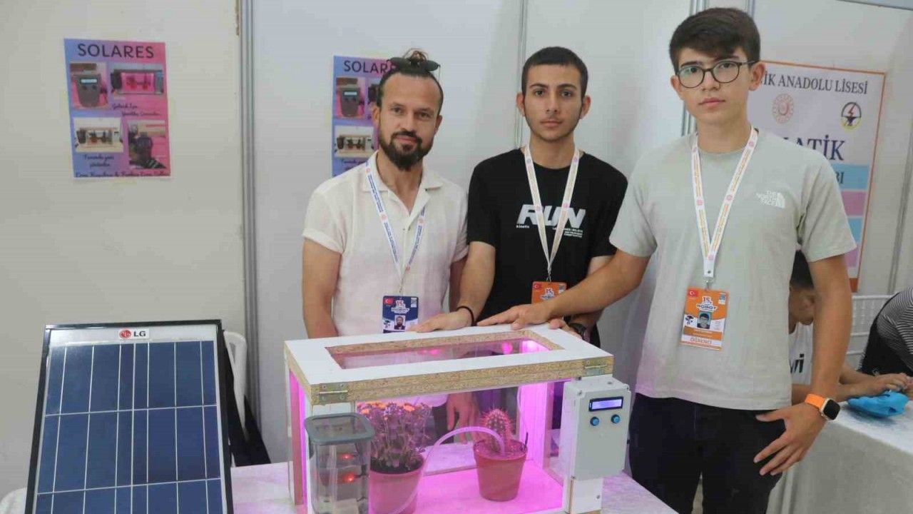 Projeyi anlatan lise öğrencisi Eren Kayabaşı, “Projenin ismi ‘Solares’. İsmi solar paneli ve sera birleşiminden geliyor. Yenilenebilir enerji kaynaklarını kullanıyoruz ve israfı daha aza indirmek için bu projeyi geliştirdik. Çiftçilerimiz evinden tarlalarına gitmeleri için bir enerji sarf etmeleri gerekiyor. Bu enerjiyi en aza indirmek için uzaktan kontrol yaptık. Burada oluşturduğumuz mini serada değerleri uzaktan izleyebiliyoruz. Seramızda botanik bitkilerinden olan kaktüs ve bir adet çiçek kullandık. Kaktüs normal bir çiçeğe göre daha az su ister. Kaktüs ve çiçeğe ayrı bir sulama sistemi yaptık. Kaktüsü ayrı ölçebiliyoruz ve iki ayrı su pompamız var, bu su pompalarından da sulama işlemi sağlayabiliyor. Su haznemizin içerisinde bir adet su sensörümüz var. Bu sensör sayesinde su seviyesi belirli bir miktarın altına düştüğü an bize alarm vermesini sağladık. Alarmın yanı sıra telefonumuza da bildirim geliyor. Bu şekilde de su tankımıza su eklemesi yapabiliyoruz. Güneş ışınlarının az olduğu ortamlarda bitkilerin fotosentezi sağlayabilmesi için biz seramızda ultraviyole ışık kullandık. Ultraviyole ışıklar güneş kadar olmasa da fotosenteze destek sağlayabiliyor. Telefonumuzdaki uygulamada çiçeklerin değerlerini ve nemlerini ayrı ayrı bize gösterebiliyor” şeklinde konuştu.
