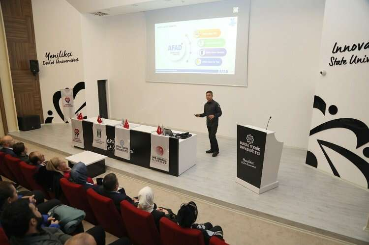Programda; afet sırası ve sonrasında doğru davranış şekilleri, afetlerde psikolojik ilk yardım, saha deneyimleri gibi konu başlıkları aktarıldı. İçişleri Bakanlığı Sivil Toplumla İlişkiler Genel Müdürlüğü tarafından desteklenen, Bursa Teknik Üniversitesi, Sakarya Uygulamalı Bilimler Üniversitesi (SUBÜ) ve Anadolu Kültür Eğitim Spor Yardımlaşma Derneği (AKES-DER) ile birlikte yürütülen “Afetlere Dirençli Afetlerde Bilinçli Gençler” projesi kapsamında eğitim düzenlendi. Mimar Sinan Yerleşkesi Erguvan Salon’da düzenlenen eğitime; BTÜ Rektör Yardımcıları Prof. Dr. Beyhan Bayhan, Prof. Dr. Barış Tamer Tonguç, paydaşlar akademisyenler ile idari personel katıldı.