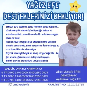 Bursa’da yaşayan ve henüz 8 yaşında olmasına rağmen ağır bir hastalıkla mücadele etmek zorunda kalan Yağız Efe için başlatılan valilik onaylı yardım kampanyası, kent genelinde büyük bir duyarlılık çağrısına dönüştü. İYİ Parti Nilüfer İlçe Başkanı Osman Çalışkan, Duchenne Musküler Distrofi (DMD) teşhisi konulan minik Yağız Efe’nin yaşam mücadelesine dikkat çekerek, tüm Bursalıları ve yetkilileri sorumluluk almaya davet etti.