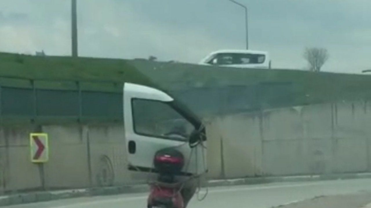 Bursa’da bir kişi motosikletine yüklediği araba kapısıyla yolculuk yapınca görenler şaşkına döndü.
