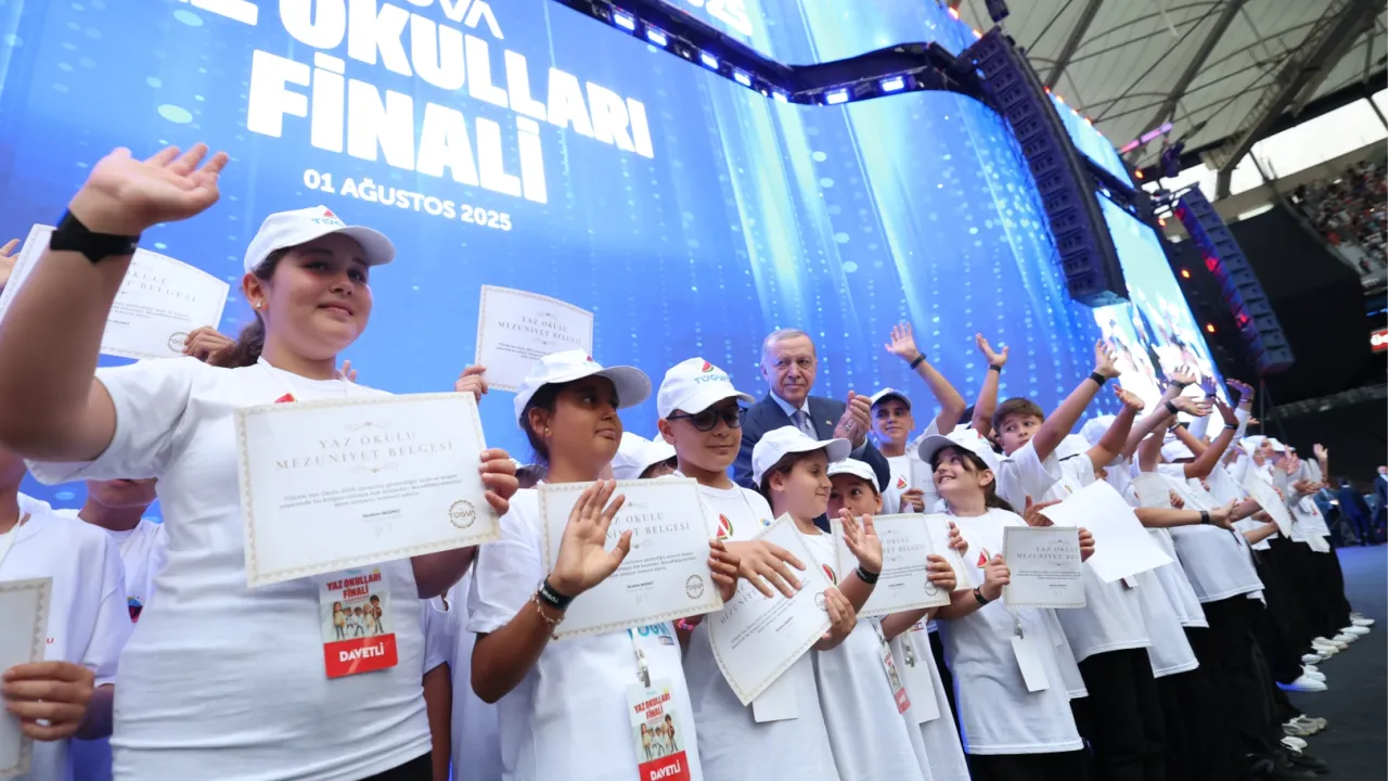Cumhurbaşkanı Recep Tayyip Erdoğan, TÜGVA Yaz Okulları Finali’nde yaptığı konuşmada, gençlerin vatana ve millete sevdalı bireyler olarak yetişmesi gerektiğini vurguladı. Gazze’de yaşanan soykırımı kınayan Erdoğan, “Filistin direnişine terör iftirası atanlara rağmen Gazzeli kardeşlerimize sırtımızı dönmedik. Zulmün sona erdiği günleri göreceğiz” dedi.İSTANBUL (İGFA) - Cumhurbaşkanı Recep Tayyip Erdoğan, Türkiye Gençlik Vakfı (TÜGVA) Yaz Okulları Finali’nde gençlere hitap etti.