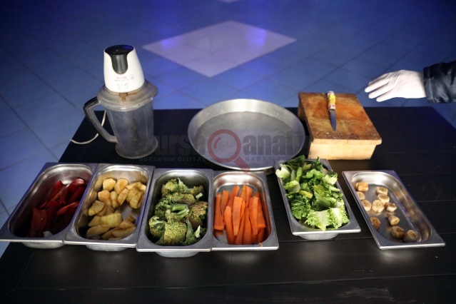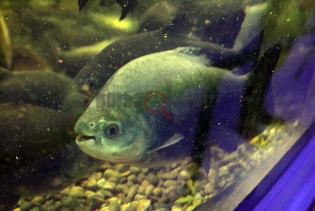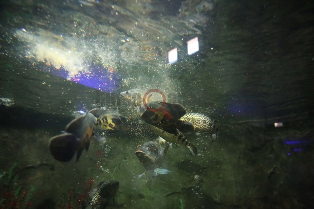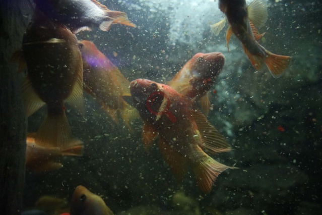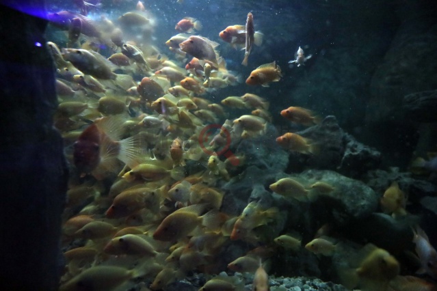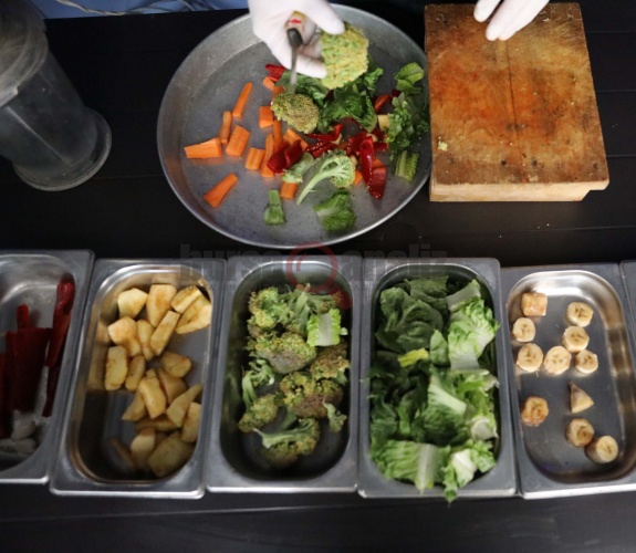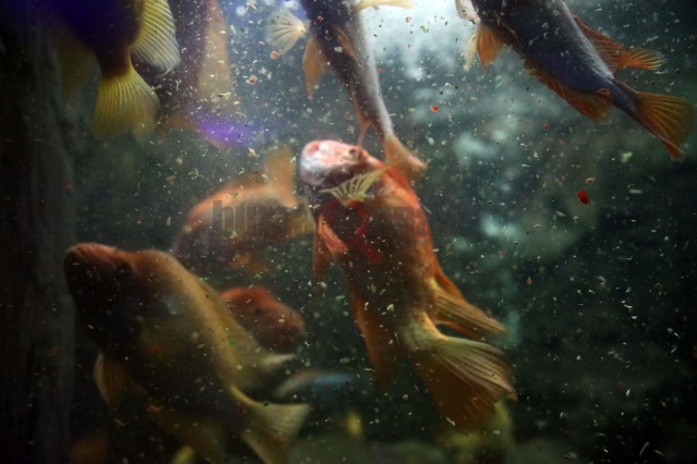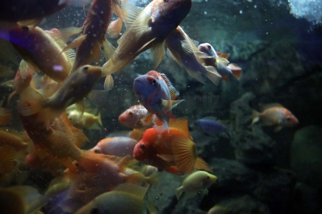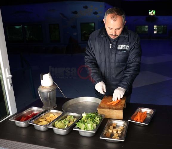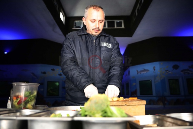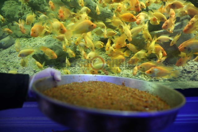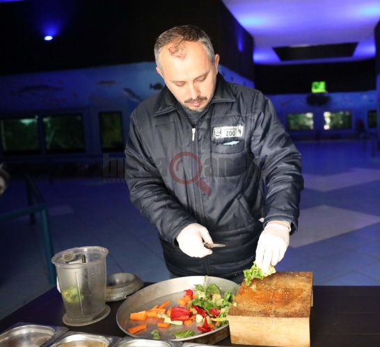 Dev akvaryumdaki balıklar, sebze ve meyve karışımıyla besleniyor