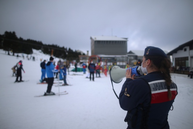 Oteller bölgesinde görev yapan jandarma da seyyar megafon ile kayakçıları sık sık maske ve sosyal mesafe konusunda uyardı.