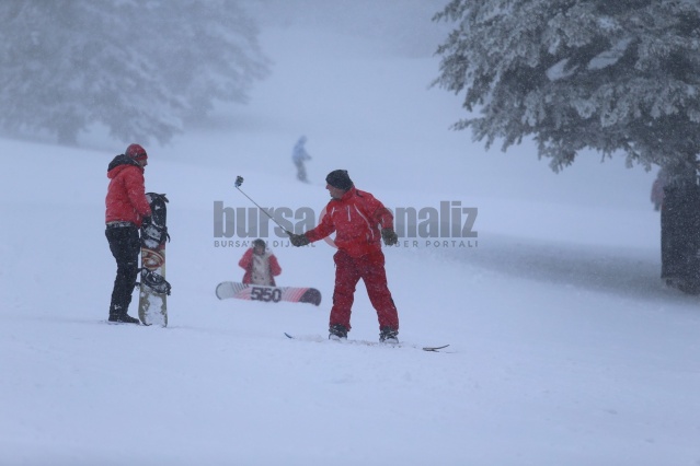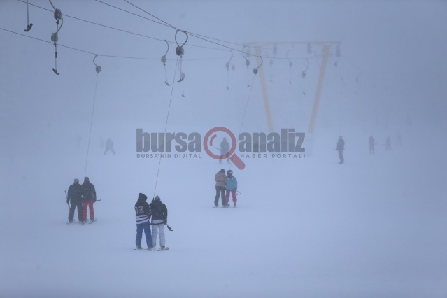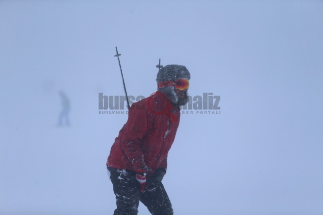 Uludağ'da aniden bastıran sis ve tipi şeklinde yağan kar yağışı, kayak yapmaya gelenlere engel olamadı.
