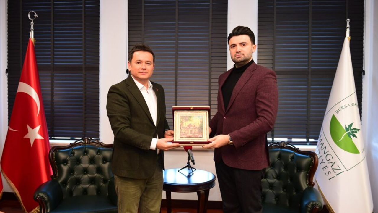 Osmangazi Belediye Başkanı Erkan Aydın ve Bursaspor Kulübü Başkanı Enes Çelik, istişarelerinin ardından karşılıklı hediye takdiminde bulundu.