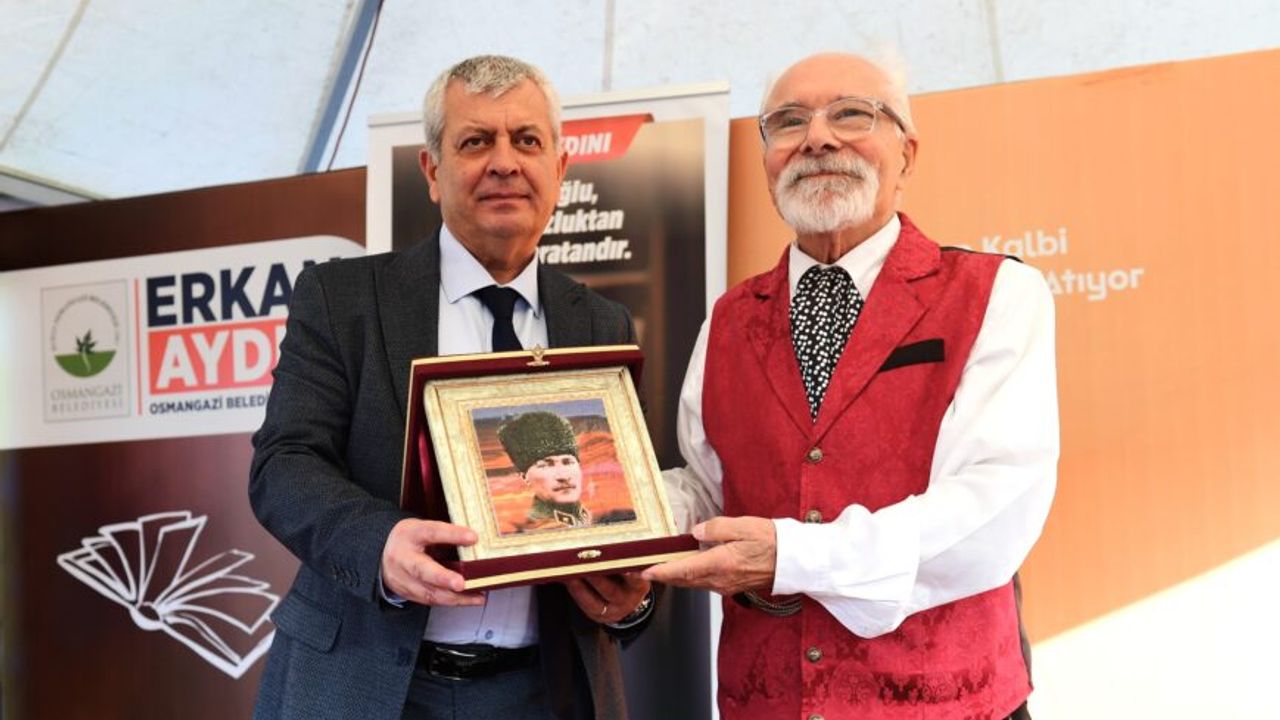 Osmangazi Belediye Başkan Yardımcısı Mutlu Esendemir, “Devrim ve Sosyoloji Açısından Cumhuriyet ve Atatürk” söyleşisinin ardından Prof. Dr. Emre Kongar’a üzerinde Atatürk, resmi olan plaket hediye etti.