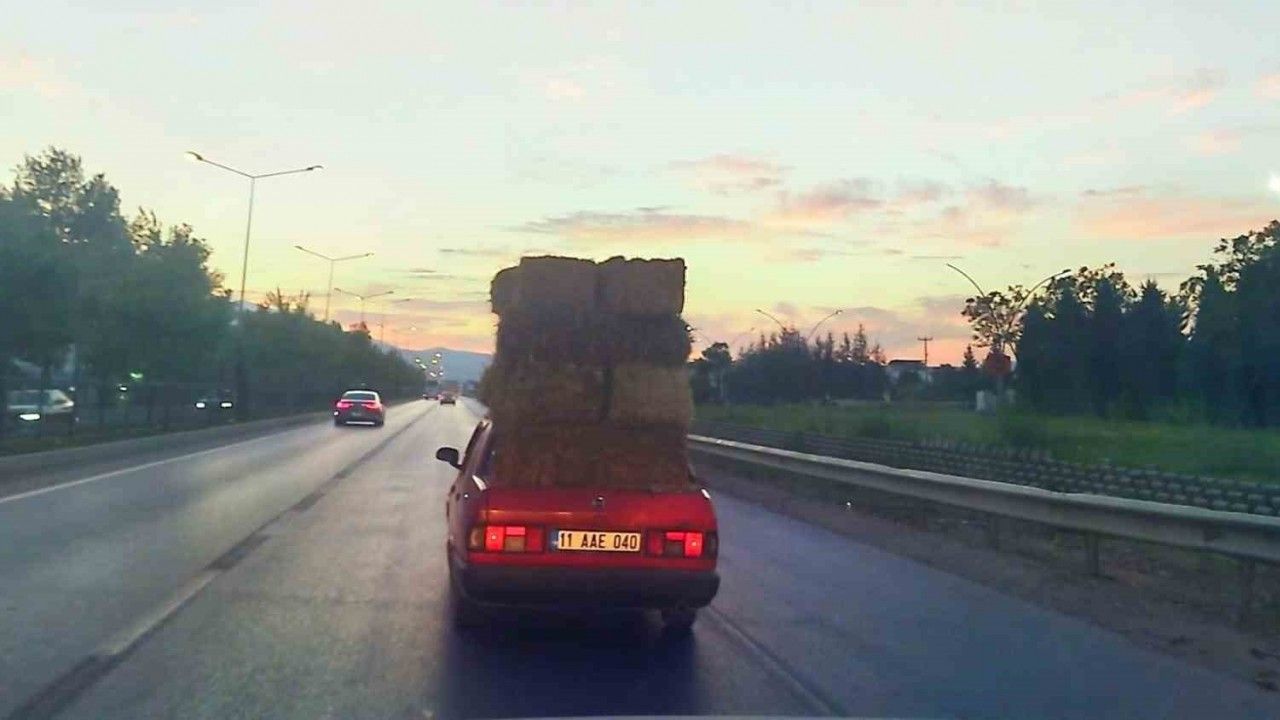 İnegöl’de henüz sürücüsü belirlenemeyen 11 AAE 040 plakalı otomobil, üzerinde 6 adet saman balyasıyla Bursa istikametine seyretti. O anlar bir sürücünün amatör kamerasına saniye saniye yansıdı.