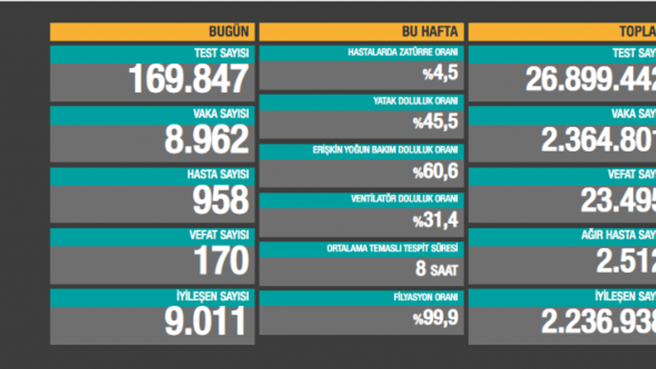 Sağlık Bakanlığının Covid-19 bilgilendirme sayfasında Türkiye'nin güncel korona virüs tablosu kamuoyuyla paylaşıldı. Tabloya göre son 24 saatte 170 kişi korona virüsten hayatını kaybetti, toplam can kaybı 23 bin 495'e yükseldi. Toplamda 26 milyon 899 bin 442 test yapıldı. Bugün yapılan 169 bin 847 testten, 8 bin 962 yeni vaka sayısı, 958 de yeni hasta sayısı olduğu belirtildi.