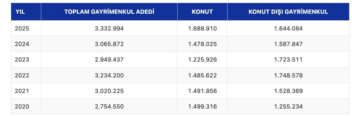 Büyük çoğunluğunu arsa ve tarlaların oluşturduğu konut dışı gayrimenkul satışları ise 2025'te, bir önceki yıla göre yüzde 3,5 artarak 1 milyon 644 bin 84 oldu.